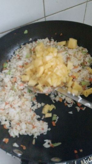 倒入煮好的米饭继续翻炒均匀后,加入菠萝翻炒,炒出菠萝香味,加入煎好的鸡蛋。炒均匀后盛出来