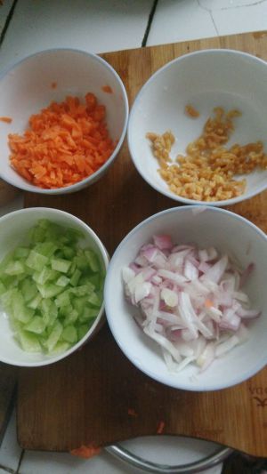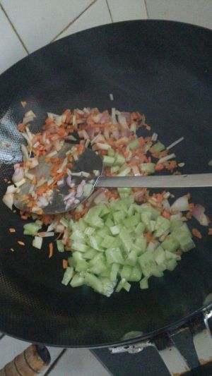 把黄瓜,胡萝卜,洋葱都切好,海米洗干净。接下来我喜欢先煎鸡蛋