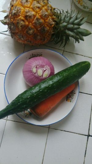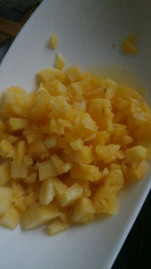 所有食材洗净切丁,菠萝肉用勺子挖出放一边