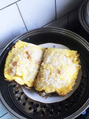 泡好的米加➕菠萝肉➕葡萄干➕糖搅拌,放入菠萝里蒸锅半小时糯糯的就成功了。