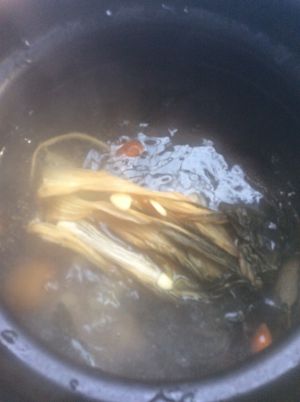 放高压锅里面!用焯排骨去浮沫的水。不够的话继续加。我用的普通高压锅,电高压锅的话没有这个弄出来好喝!大火喷15分钟。等放气,小火煮20分钟~可以放点香菇。这次我放的冬瓜~