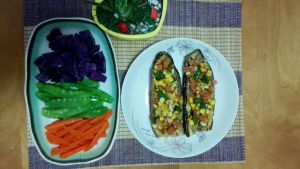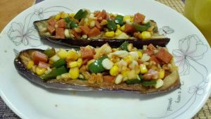 茄子切4半,中间切格子,抹点盐,用平底锅煎熟茄子。装盘,把馅料放在茄子上,最后油爆蒜蓉浇在茄子上,五彩缤纷烧茄子就做好啦!