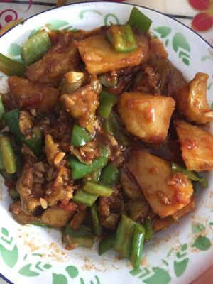 蒜末起锅,放入适量的番茄酱,倒入炸好的茄子,翻炒2~3分钟,倒入青辣椒,翻炒2分钟,倒入之前准备的料汁,大火收汁,就可以出锅了