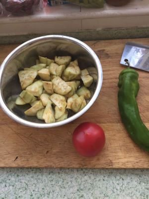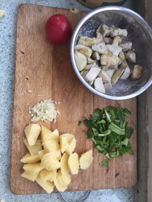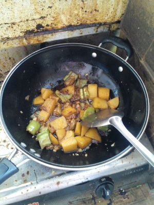 把西红柿切碎 油锅热了放入西红柿丁蒜末炒香出味 然后放入茄子土豆翻炒 然后放入青椒 倒入自己调的汁 大火收汁