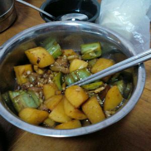 油锅热了放土豆 茄子撒盐控水倒出备用油炸到金黄出锅