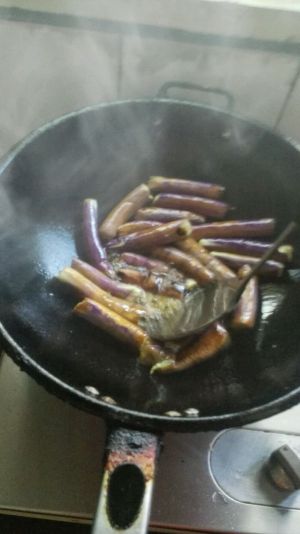 在锅中倒入菜油,油热后把茄子掰成两段放入热锅中,让它炸,一两分钟翻动一次,直到茄子变软。