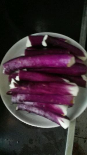 茄子切条,撒点盐腌蔫;豆角掰段,豆角放入盐水中浸泡。
