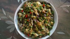 锅里留油,葱蒜、干辣椒爆香,放入茄子和豆角稍微炒一下。
