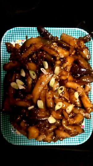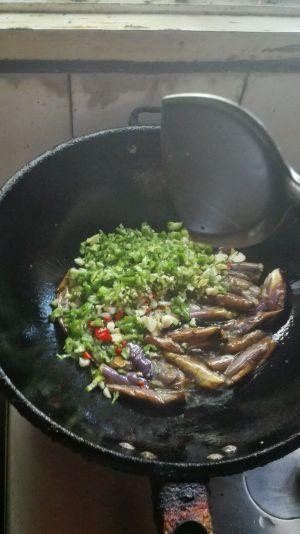 下茄子炒翻均匀,加少量水,炒至茄子变软,淀粉水勾芡,收汁,出锅,撒葱花