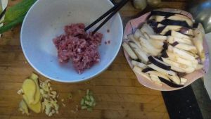肉末加盐少许,淀粉搅拌上劲,茄子切滚刀块,姜切片,蒜切丁,葱切丁