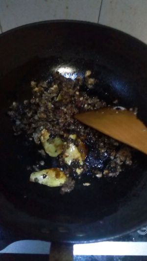 放豆瓣酱炒至变色,加适量老抽,白糖炒至