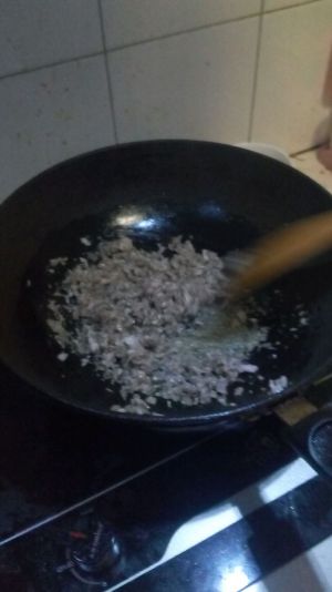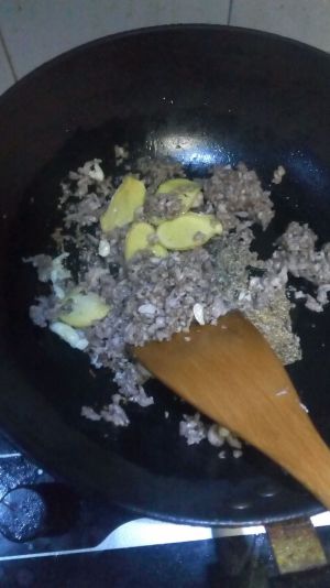 锅里留底油,放入姜丝蒜末,再放入肉末翻炒
