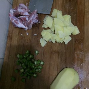 排骨热油炒至肉焦状,加入姜蒜末和西红柿丁,西红柿出汁后加入土豆片翻炒,然后加入开水,生抽和盐少许,煮8分钟左右,即可。