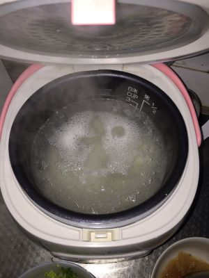 大米洗净倒入臻米电饭煲中,把香菇胡萝卜和姜片也都倒进去,开启稀饭按钮。