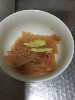 鸡胸肉切丝用盐和姜片腌制,我放冰箱腌了一夜,鸡肉吃起来很香,也有盐味。我还放了香油。这样做出来的粥很香