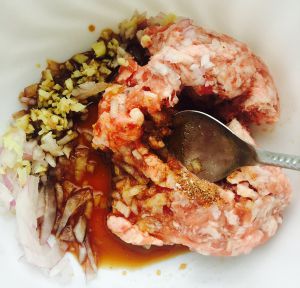 猪肉剁碎。 选瘦肉比较易剁,但五花肉更有嚼劲。 还有猪肉用刀剁比用机器打碎更好吃一点。