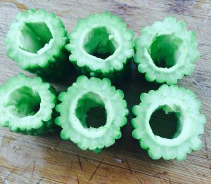 用筷子掏空瓜瓤部分。 我买的这些苦瓜皮有点厚了。大家可以选皮薄一点的苦瓜。皮越薄越好,可以塞进更多肉馅,也更容易煮熟。