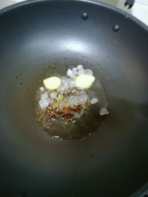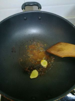 热锅冷油,等油微热后倒入生姜、大料、桂皮、冰糖不停搅拌。