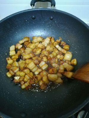 冷锅倒油放冰糖炒制融化,加猪肉翻炒,上色以后加红烧酱油继续炒,边边有焦焦的感觉,倒热水,如果到冷水会收缩,肉会硬,然后下姜片和香叶桂皮