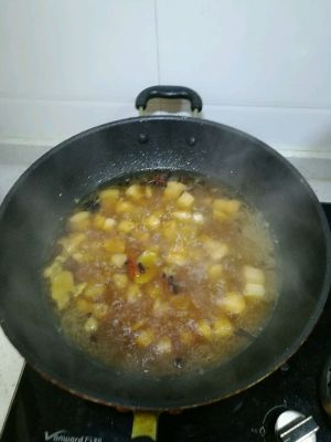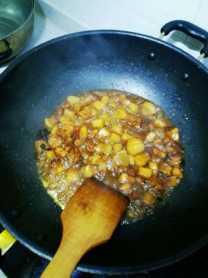 最后肉顿好后放入盐,大火再收汁,也要不停翻炒。如果之前上色不太理想,在准备收汁的时候还可以再放少量冰糖上色。