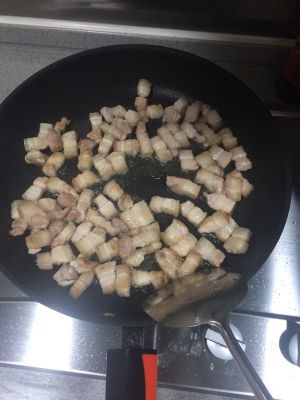 锅里少放油,先放猪肉煸炒,炒出点猪油。