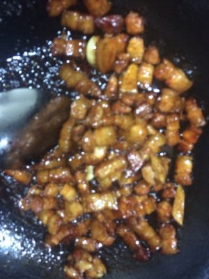 锅烧热,倒食用油少许,放入之前准备好的大料等煸炒片刻捞出,放入切好的五花肉煸炒至肉质金黄倒出备用,此时锅内剩少许油。