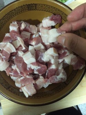 五花肉切块,冷水入锅汆烫,煮开后盛出并用冷开水冲洗去血沫,晾干待用