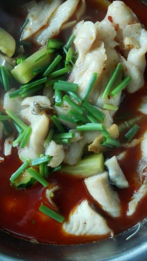 鱼肉放入锅中,用筷子划散,煮熟带汤一起放入盆中的菜上。码上葱蒜,辣椒,烧热菜籽油,淋上