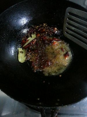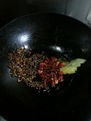 干炒花椒的锅里放入油(比平时炒菜多点就行)放入2片香叶,少许干辣椒段,还是小火翻炒