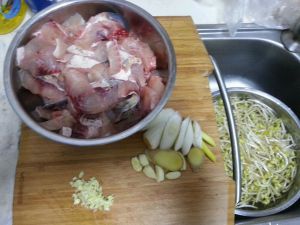 准备材料,将草鱼分解,黄豆芽洗干净,葱姜蒜少许,蒜末少许