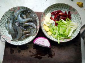 将虾洗净,开背去掉虾线,大葱、芹菜切段,姜蒜切片,洋葱切粗丝。