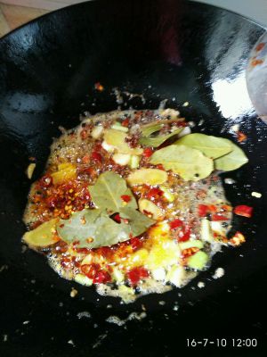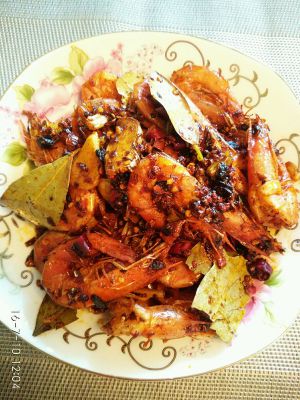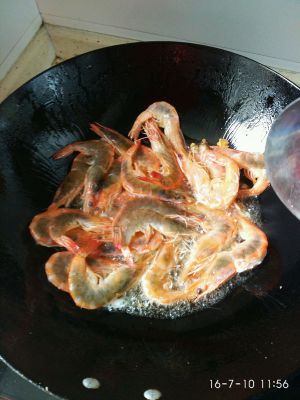 热锅倒油!差不多就可以了!有环境就油多点儿专门油炸的容易内炸没有就这样爆炒!炒出香味颜色都变红了再盛出装盘待用! 之前的虾装盘锅里应该是有剩余的油的!剩余的多就不用加油了!不够就再加点儿!接着把以上大料都倒入锅底爆香!别爆老了!随意炒虾马上把虾倒入下锅!爆炒依次加盐、酒!酱油!翻炒几下即可!