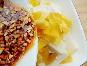 豆腐盒子打开后直接切好小块,避掉水以后倒扣进容器,盖在皮蛋的上层。