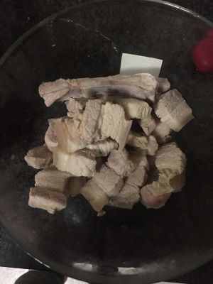 整块五花肉冷水时放入锅中,煮开后一二分钟后捞出,过凉水。切成两厘米见方的块状。