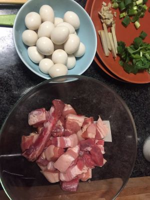 先把红烧肉切小块 用料酒盐腌制一会 把鹌鹑蛋从很难开的罐里面整出来洗一下 (因为我在澳洲只有罐头鹌鹑蛋,国内的亲要先把鹌鹑蛋水煮下 拨开蛋壳 备用) 把姜切好