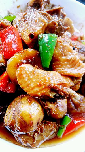 制作板栗烧鸡的材料:土鸡半只、板栗300克左右(可以多放一点板栗,我个人觉得板栗烧在里还多好吃的,甜甜的)、花椒、大料、八角、姜、葱(大葱、小葱都可以)、菜籽油、青、红椒(大的海椒,哈哈)。 土鸡洗净,砍成小块,烧一锅水,水开后放在水里焯一下,去血水后,用冷水洗净控干水分后待用,热锅,倒油,油热后放入姜、花椒、大料、八角炒香后,倒入沥干水分的土鸡块放在锅里炒出香味后,倒少许的料酒、继续炒干水分后放入少许的盐、生抽、老抽,在放入抺过鸡肉的水就可以了。(在炒鸡的时候,准备以下食材)。