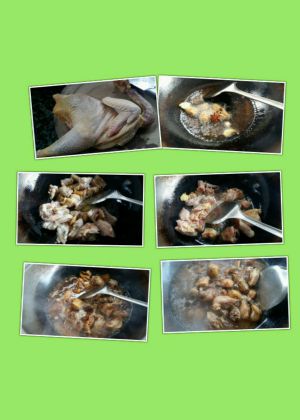 把鸡翅鸡腿洗净剁成块,焯水捞出沥干水分;板栗冲洗干净备好; 2.锅里放入适量的五古三香花生油,油烧至5成热,放入几粒冰糖炒出糖色,加入鸡块炒匀;