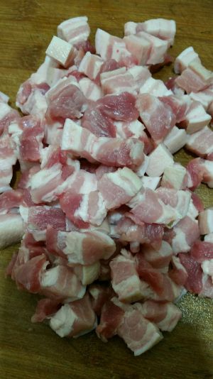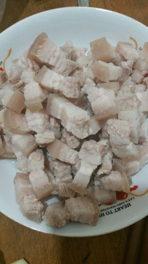 五花肉切成方块待用,锅内放水,姜片,烧开后放入五花肉煮至六七成熟。