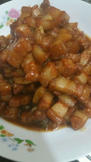 开锅盖,放入盐,浓缩鸡汁(这样可以省略味精,而且汤汁更稠)最后放入冰糖,大火翻炒,收汁。