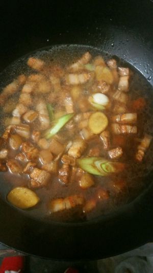 再依次倒入生抽,老抽,水(末过肉即可)等水开了,放入红曲米粉(可不放,为了增色)一把葱,再次翻动下,盖锅盖,转小火煮一个半~两个小时。
