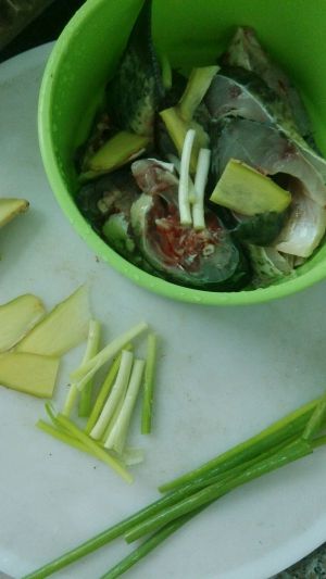 生姜切片,小葱切段,拿一半的量加料酒和少许盐腌鱼切好的鱼,另一半留着炝锅。鱼腌五六分钟后之后,加两勺淀粉抹入鱼身