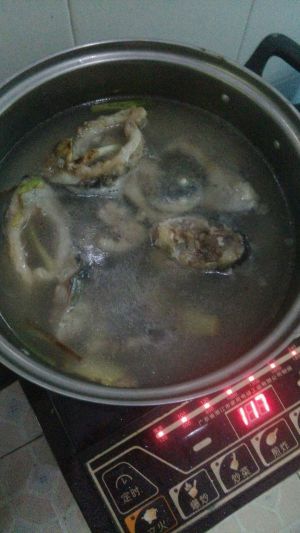 马上盖上锅盖,改中大火,开始煮鱼。(一定要中大火,如果火小了,汤则是清的,不白)