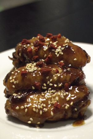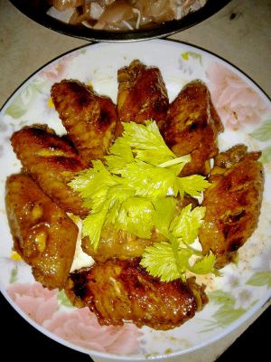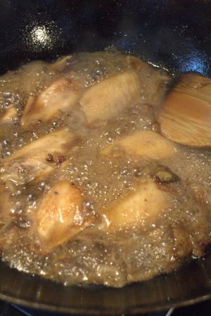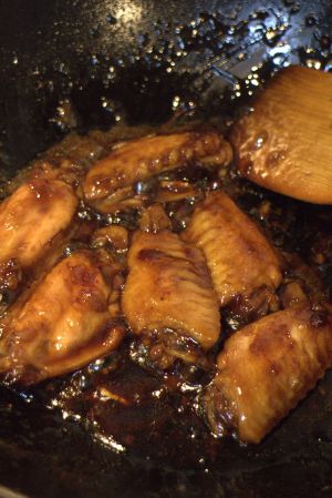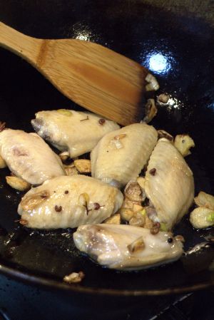 先放油把姜葱蒜花椒爆炒香,放入鸡翅,然后放入料酒、酱油翻炒