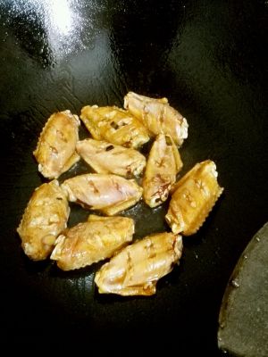 煮完盛出来,清洗锅烧热倒油,热锅凉油放少许白糖,把鸡翅放里边翻炒至金黄