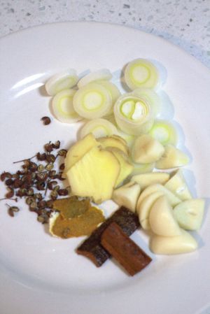 准备姜、蒜、花椒、大葱(这些都是去腥的哦)另外放了一点点橘子皮,为了回甜放的。