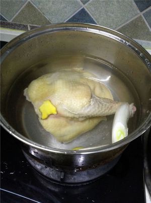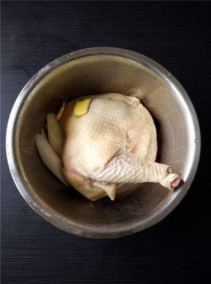 第四步:高压锅中加入3000g水、葱姜、5g盐和5g料酒,放入鸡,高压锅上汽后关火焖煮20分钟左右,打开盖子捞出鸡沥干晾凉;