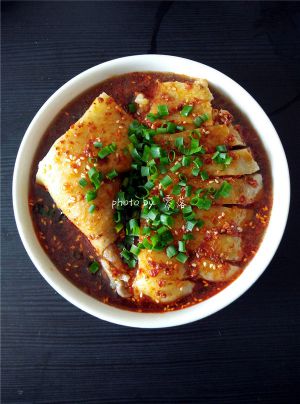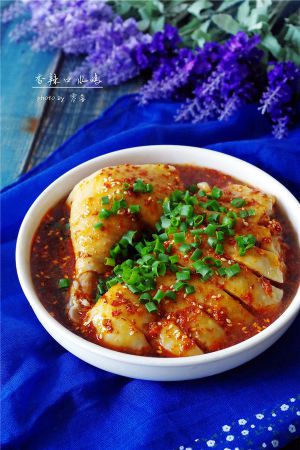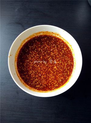 在焖鸡的时候,做红油。加入比平时炒菜稍多的油,中火烧热放进葱、姜、蒜、花椒一起炸香,同时准备一个耐热的容器放入2勺辣椒碎。待葱、姜变色之后立即转小火,并迅速捞出,趁着热劲将油倒入辣椒碎里,这样红油就搞定了。