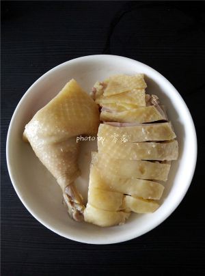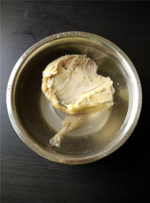 出锅后,用凉水把鸡冲凉,会使鸡肉紧缩保持入口有弹性,口感脆。用刀把鸡肉分解。