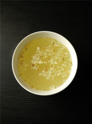煮鸡肉的同时,可以先处理姜蒜:剩余的姜片同大蒜一起剁碎后,调入适量凉白开,搅拌均匀后静置片刻;姜蒜水可做点,放冰箱冷藏可保存2—3天,做凉菜很方便;