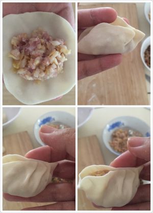 有人问过饺子皮只往一边收怎么收,请看图。饺子皮对折,右手捏住半圆的右角,左手就一个褶一个褶的叠过来。期间左手还可以把馅往已经捏好的右边按进去,真的能包好多馅啊!